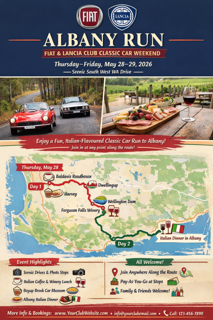 The club run to Albany is on Thursday and Friday 28 – 29 May.